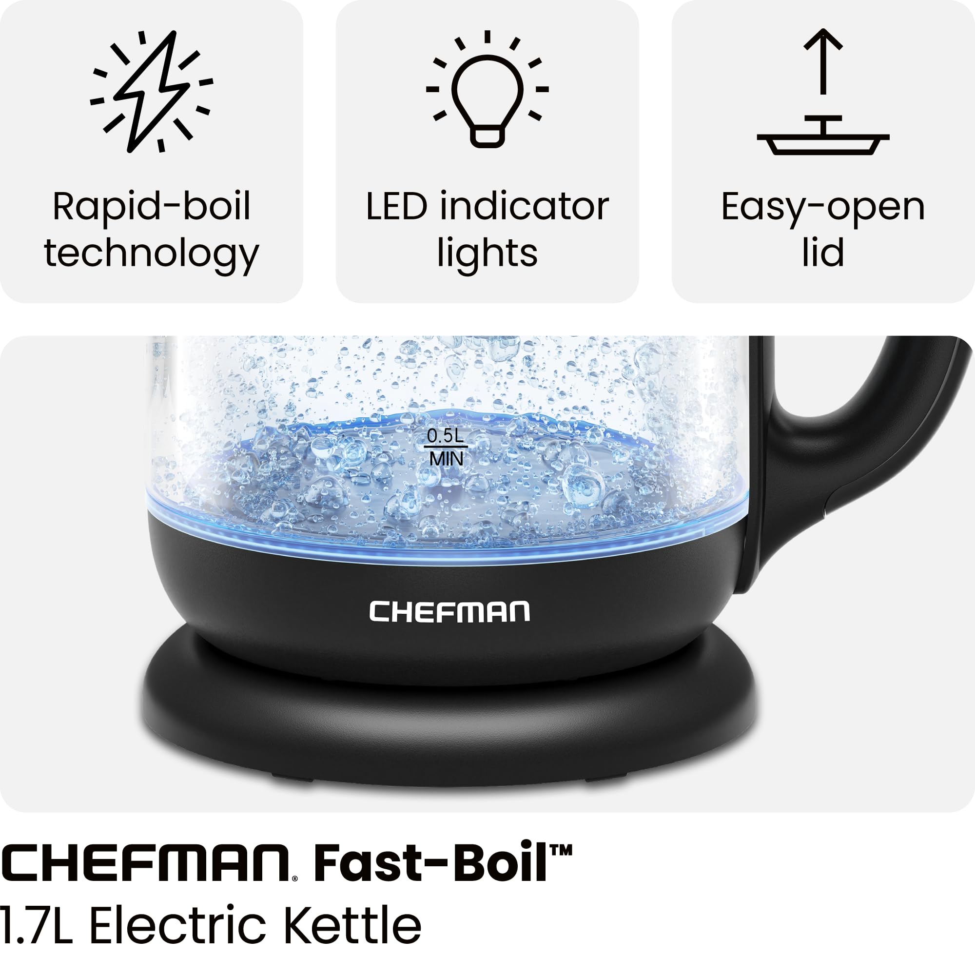 - SUPERIOR SPEED: Reach boiling temperature in just seven minutes with the Chefman Electric Glass Kettle from the No. 1 kettle manufacturer. It boils water more quickly than the microwave or stovetop methods, so you spend less time waiting for your delicious hot beverages and more time enjoying