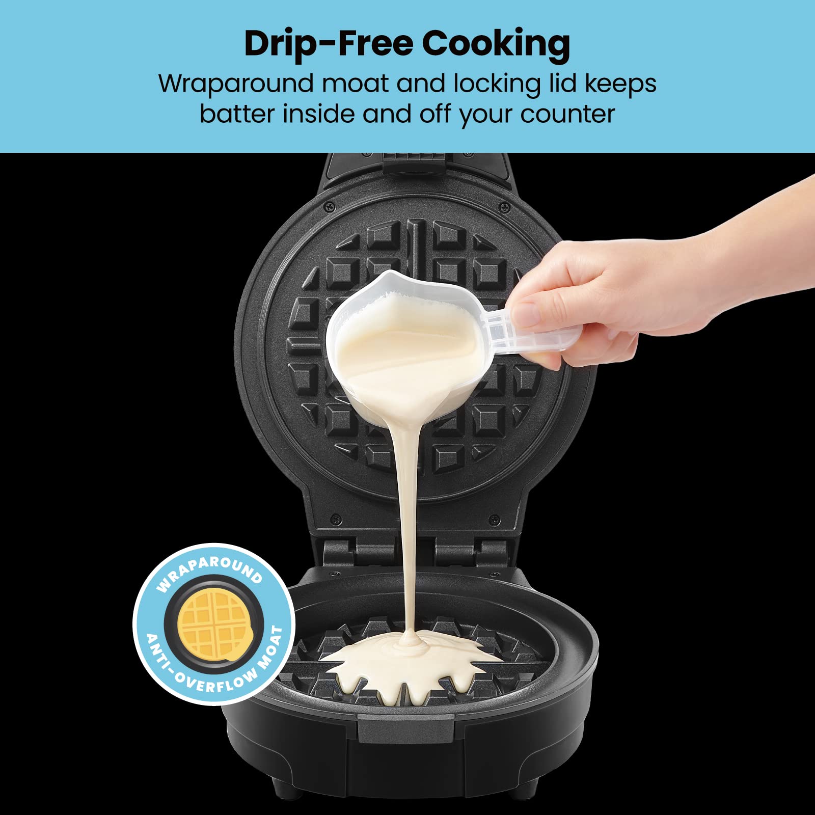 - MESS-FREE: Get the gourmet breakfast you crave without any added hassle or mess. Our uniquely designed anti-overflow moat makes fluffy waffles without leaving behind a drippy mess.