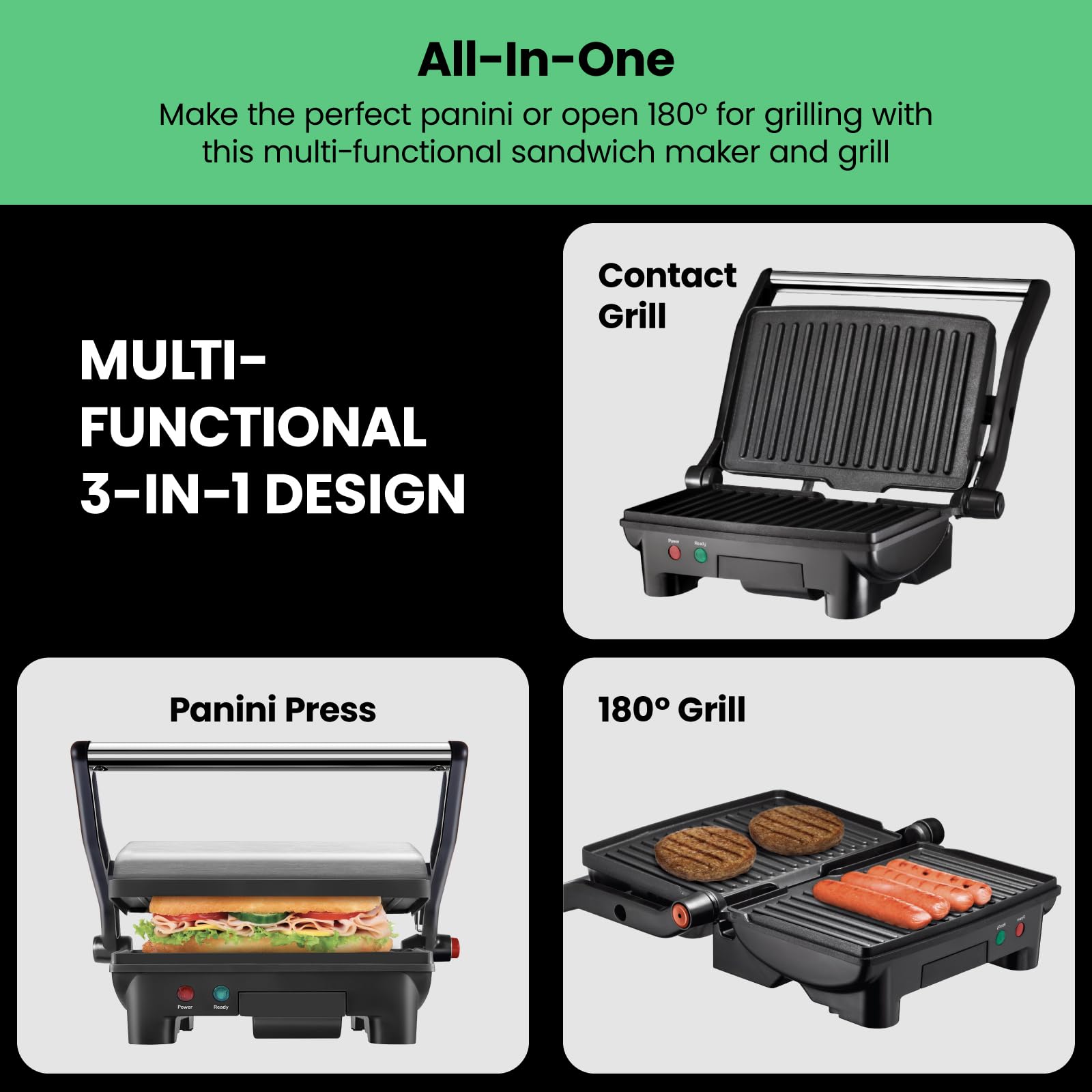 - HUNGRY FOR A SANDWICH? With just the push of a button, this Grill-Panini Press Combo can be used to press your custom sandwich or open at 180 degrees for grilling burgers, steaks, veggies and anything else you’re craving quickly and easily! Use it as a panini press for perfectly crisped bread- no cooking spray required.